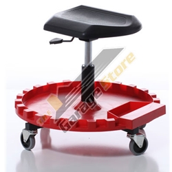 (4) 2.5 in. casters and a rotating tool/parts tray. Seat offers a foam base with a textured rubberiized cover.